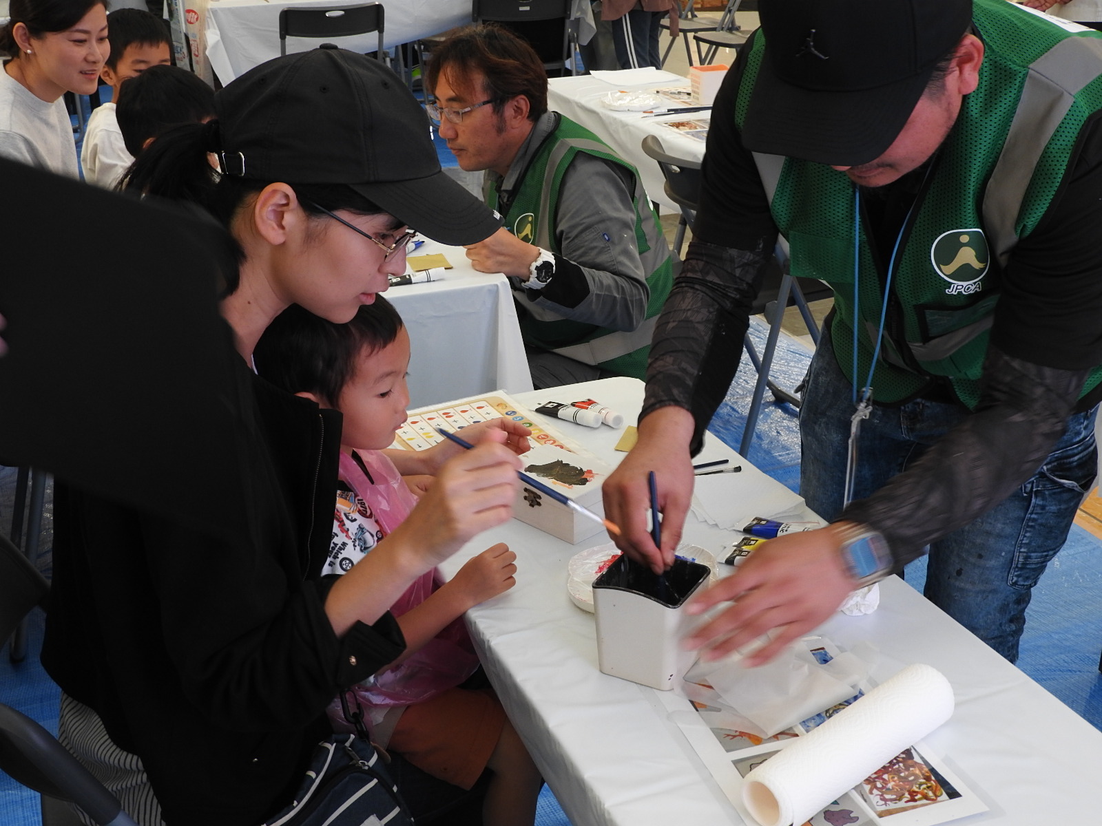 塗装技能士会は、木製の小箱に宮崎犬などのイラストを餌付けする体験コーナーを設置し、参加した親子塗装技能士会の入田修一会長は、「私達も塗装という仕事の意義を再確認することができる」とイベントの意義を強調し、「純粋に楽しんでもらいたい」と話しました。